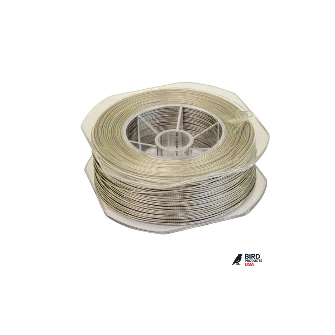 This 1×7 strand wire has a breaking strength of ~100 lbs, suitable for residential and light commercial bird control.